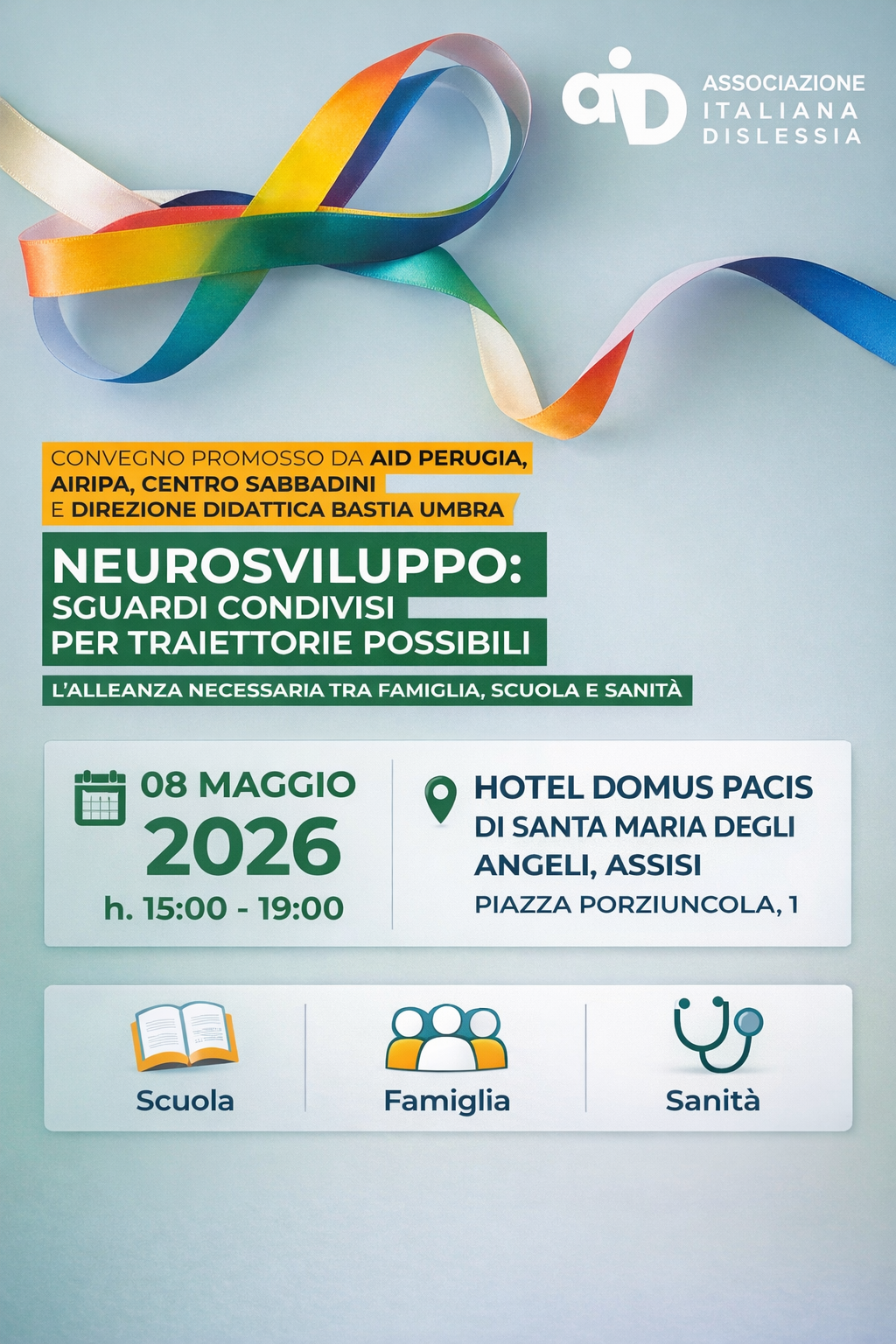 L’8 maggio 2026, ad Assisi, si terrà un importante incontro dedicato al tema del neurosviluppo e dell’inclusione scolastica: “Neurosviluppo: sguardi condivisi per traiettorie possibili”. Promosso da AID Perugia insieme a AIRIPA e ad altri enti del […]